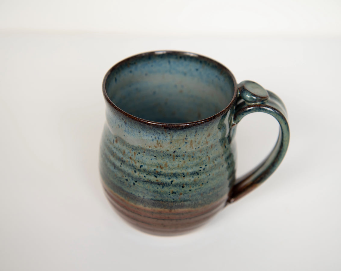 14-16 ounce bulbous shaped coffee tea mug. Simple, traditional, elegant. Blue and a deep earthy, iron red glaze. Thumb rest. This is the mug shape and sized most frequently used in our house, from the littlest cousin to the coffee loving French grandmother! Dishwasher safe. Food safe. Microwave safe. Each mug varies slightly in size but are approximately 4 inches tall, the base is just over 2 inches and the top opening is just over 3 1/2 inches.