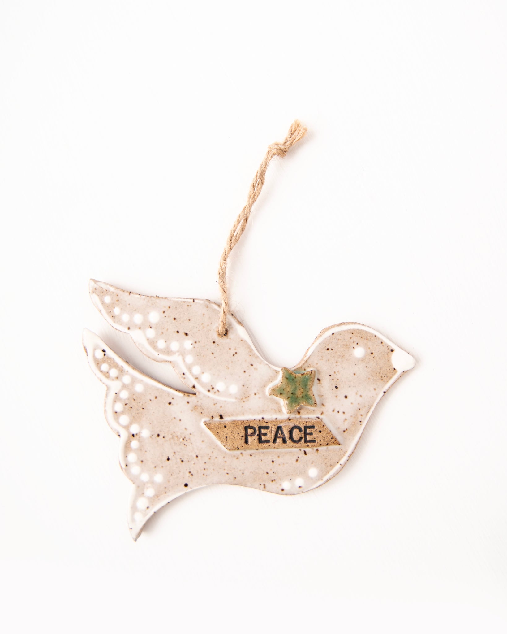 A peace dove... this white on white ornament can stand alone as a symbol for the holidays. Slip trailed, embellished with the word "peace" , and decorated with a simple green star this dove is sure to stand out on your tree or wreath. (Approx. 3 1/2 x 4 1/2 inches)