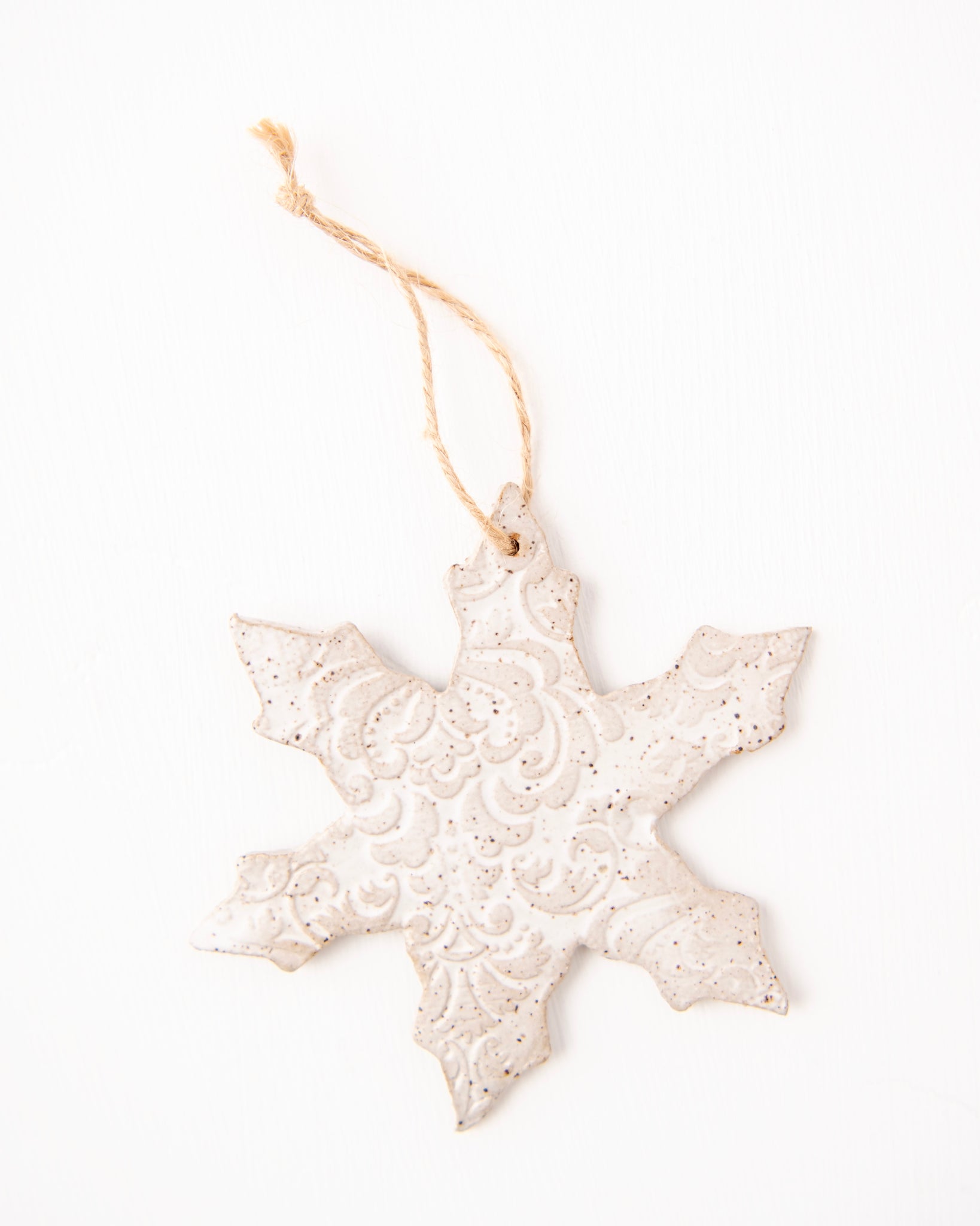 Approximately 4" snowflake ornament. Clay is rolled in lace and glazed matte white. Speckled clay. These are also lovely as package tie-ons!