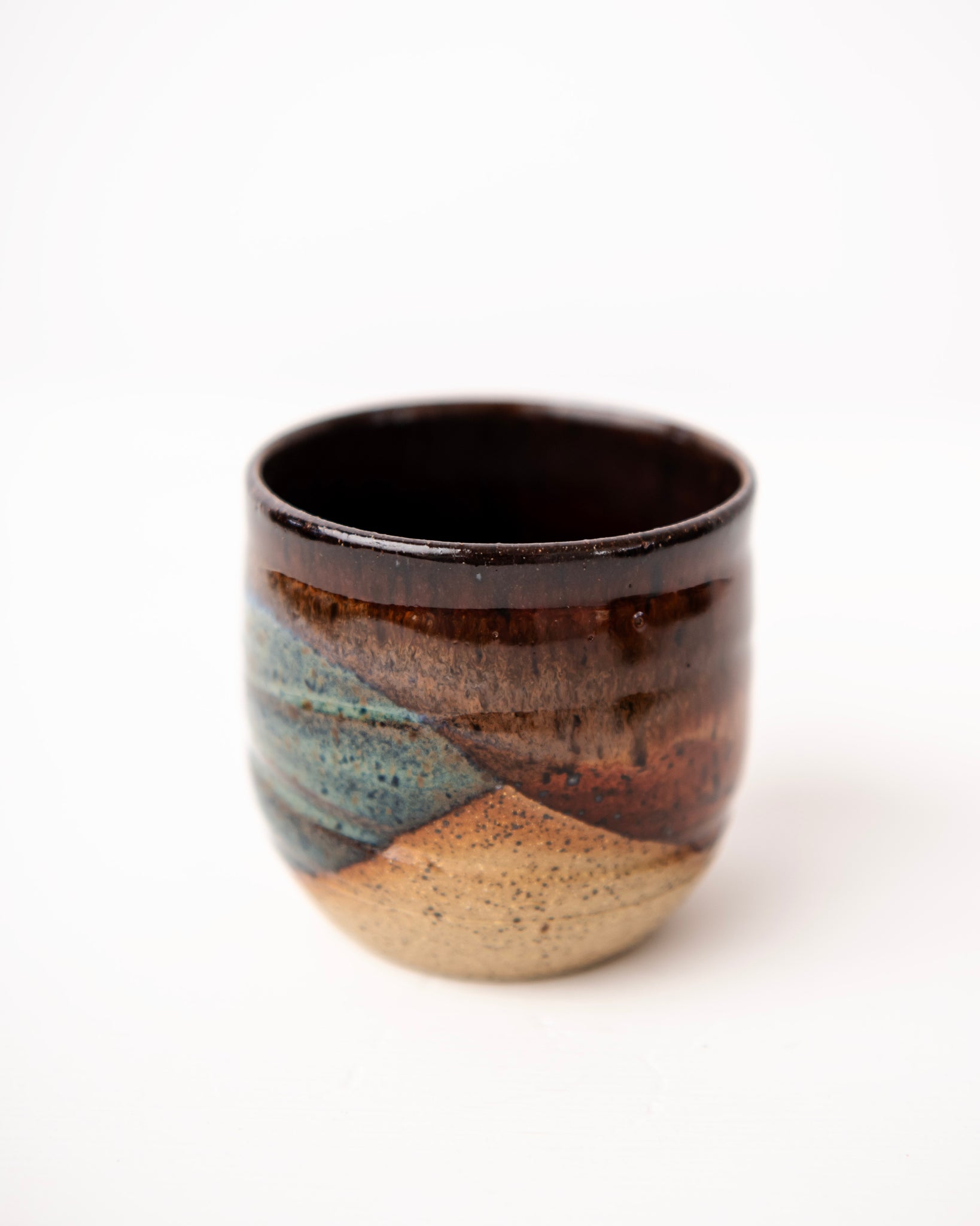 Set of 2 small hand thrown cups perfect for espresso, whiskey or your favorite spirits! Blue and brown glaze (overlap looks purple). Food and dishwasher safe. Each holds 4 ounces.